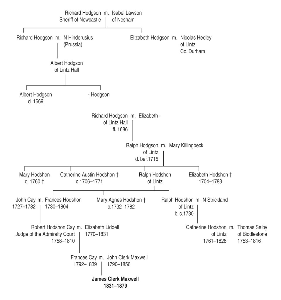 Dr Richard Gilpin was a well-known Puritan leader. His son William Gilpin of Scaleby Castle was a friend of the Baron. William’s grandson, Rev. William Gilpin, was ordained in 1746 by the Bishop of Carlisle, father of Catherine Fleming. Rev. Gilpin’s ‘picturesque’ concept influenced John Clerk of Eldin’s drawings. Dr. Jabez Cay’s brother John was the grandfather of John Cay (1727‒1782) who in 1756 married Frances Hodshon of Lintz and started thereby the Edinburgh Cay family to which James Clerk Maxwell’s mother belonged.
